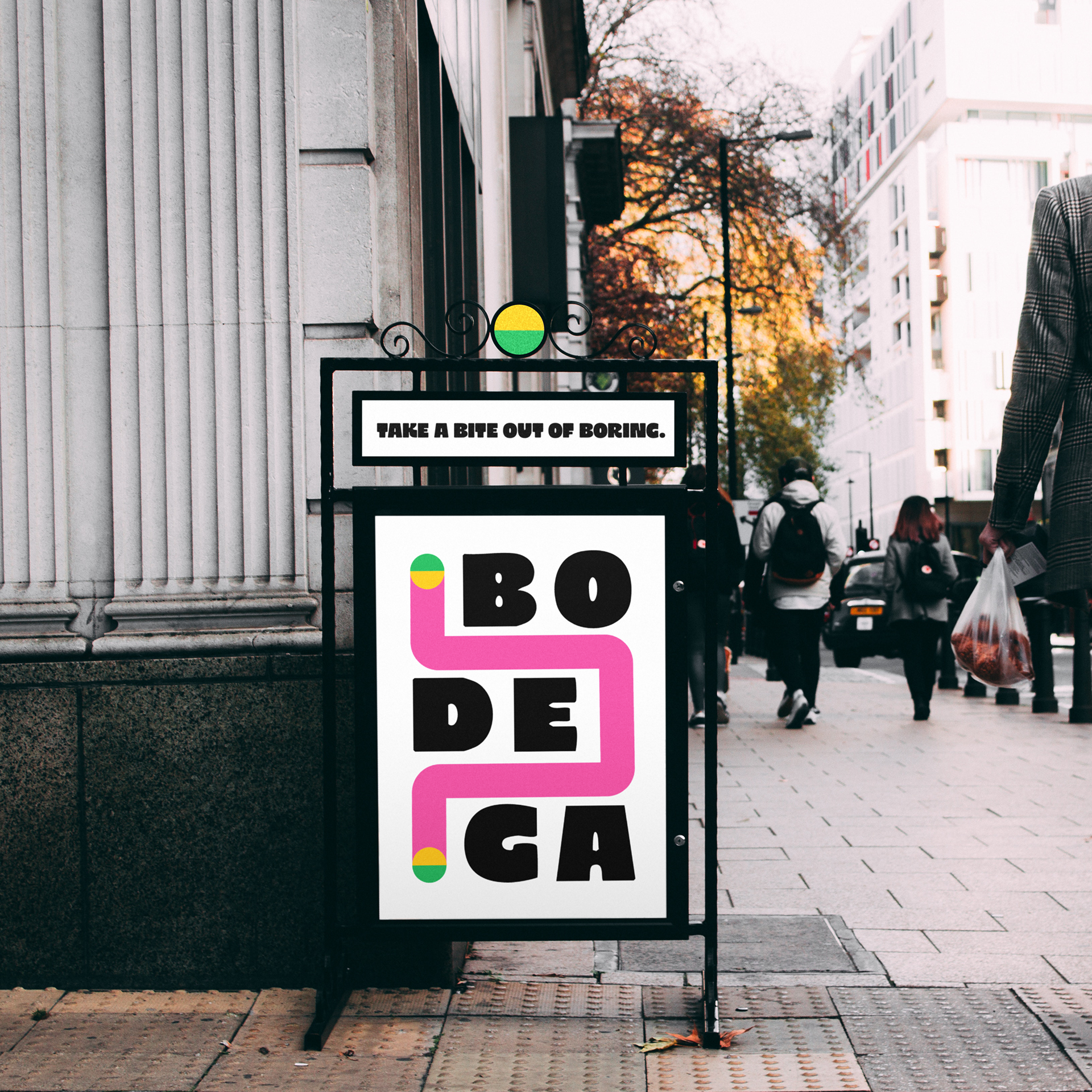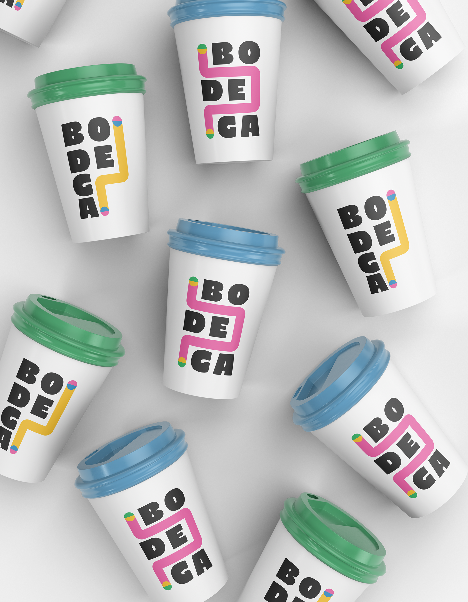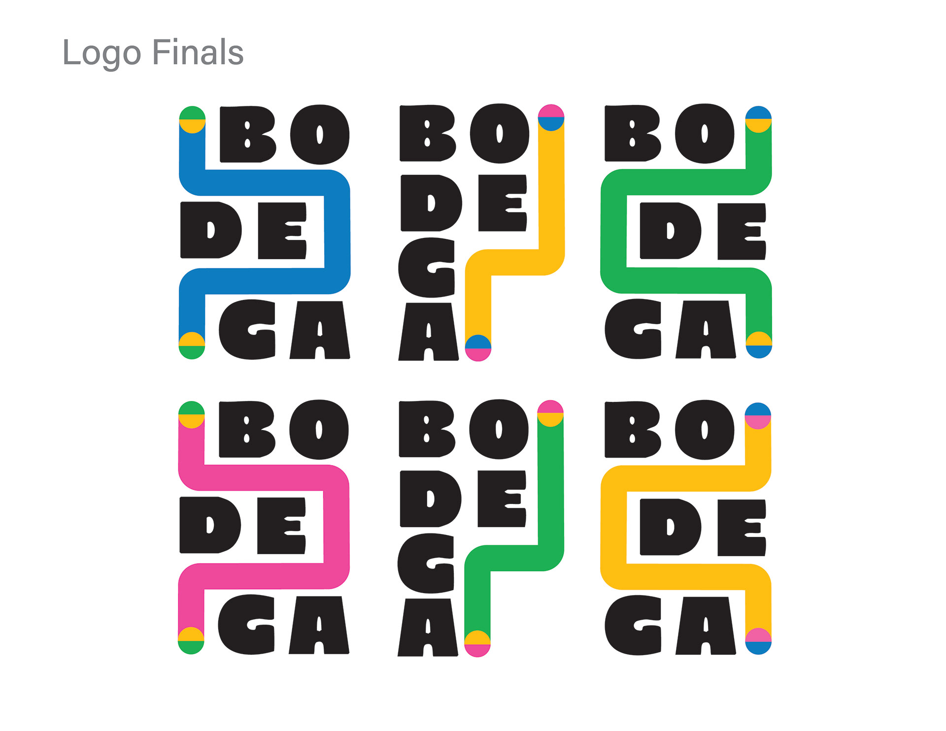 The final logo contains a thick, chunky typeface that is fun and quirky, while still reminiscent of the lettering on bodega signage. The colorful line in the design is variable, weaving around the type stack and symbolizing the consumer's journey from Point A to Point B throughout their day.
